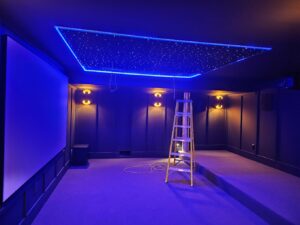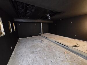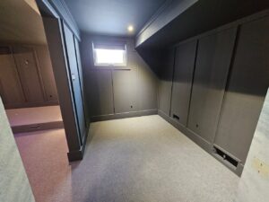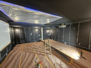 At PURITY PAINTING INC, we recently completed an exquisite theater room project designed to provide an immersive, non-reflective environment perfect for hosting events. The room features a sleek flat black finish that minimizes reflections from overhead projectors and side lighting, creating a truly cinematic experience. This elegant space, complete with a vintage-style popcorn machine, emulates the charm of a 1930’s theater.